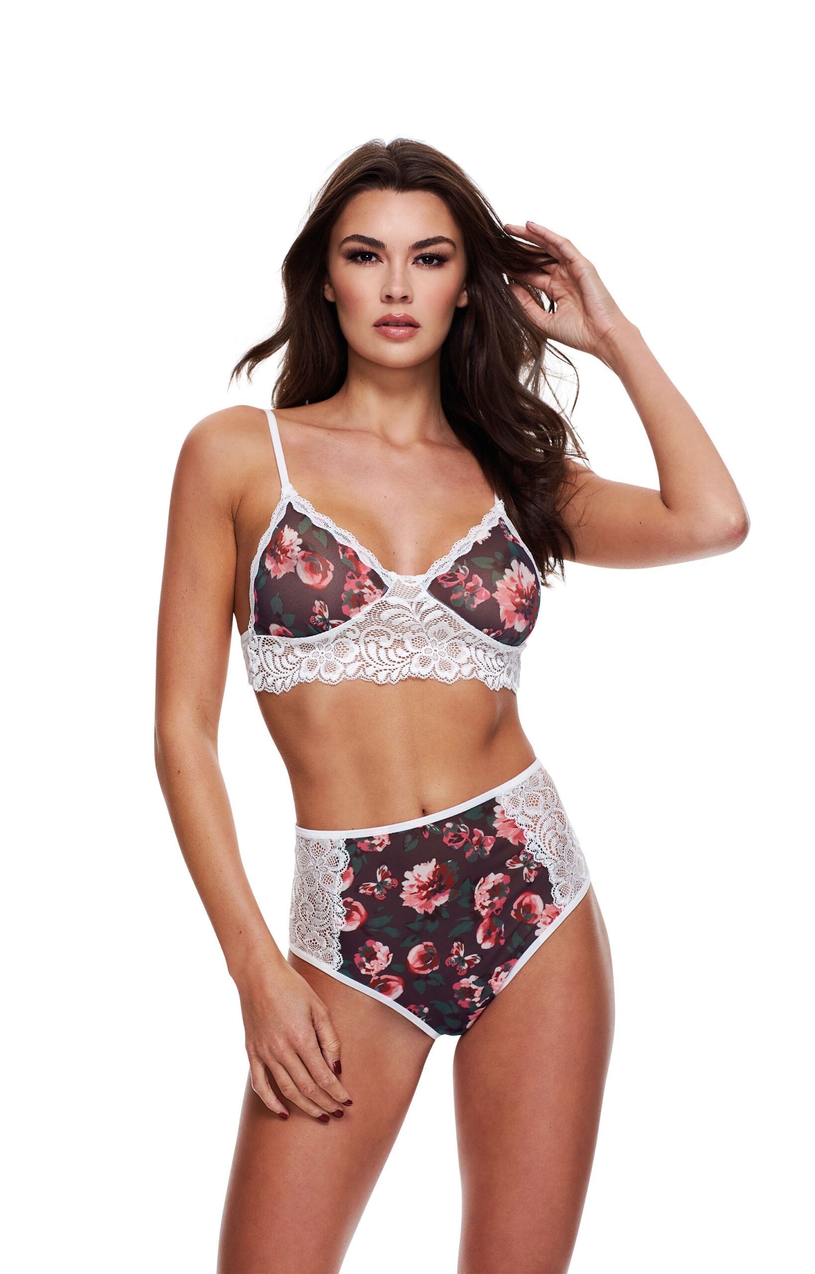 Completo reggiseno floreale grigio e pizzo, XL