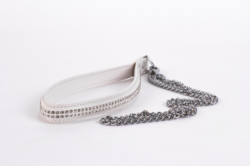 Manico in pelle di agnello con 2 file di piccoli strass e catena in metallo bianco