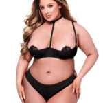 Rinnova un look classico con dettagli giocosi con questo splendido completo due pezzi! Realizzato nel classico nero notte, il reggiseno a un quarto di coppa è impreziosito da dettagli in pizzo floreale trasparente e da una spallina regolabile stile halter (non c’è bisogno di aggiungere una collana!), mentre il perizoma abbinato sembra una mutandina tradizionale nella parte anteriore, con un look minimalista a doppia spallina nella parte posteriore!