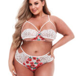 Completo reggiseno e slip con fiori rossi e pizzo bianco. Il reggiseno ha spalline regolabili e si chiude sul retro. Aperture a vista sotto e sopra il pizzo sulle coppe.