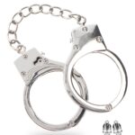 Mantieni il controllo sul tuo sottomesso con queste pesanti manette BDSM placcate in argento. Le manette bondage sono regolabili. Due chiavi e una custodia incluse.