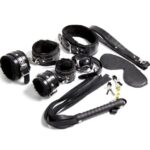 Compresi morsetti per capezzoli, polsini alla caviglia, polsini alle mani, fruste, benda agli occhi, bavaglio a sfera, collare.